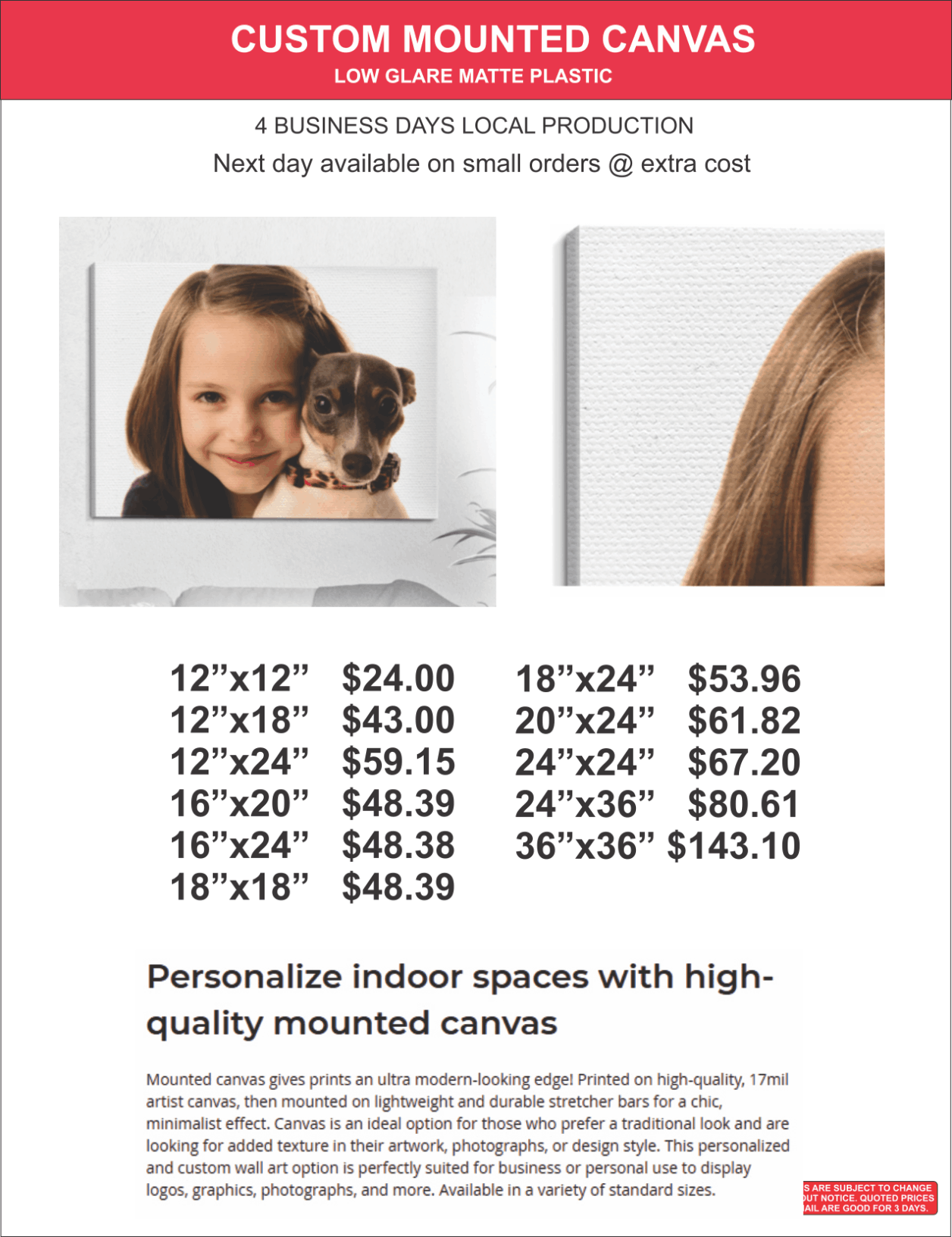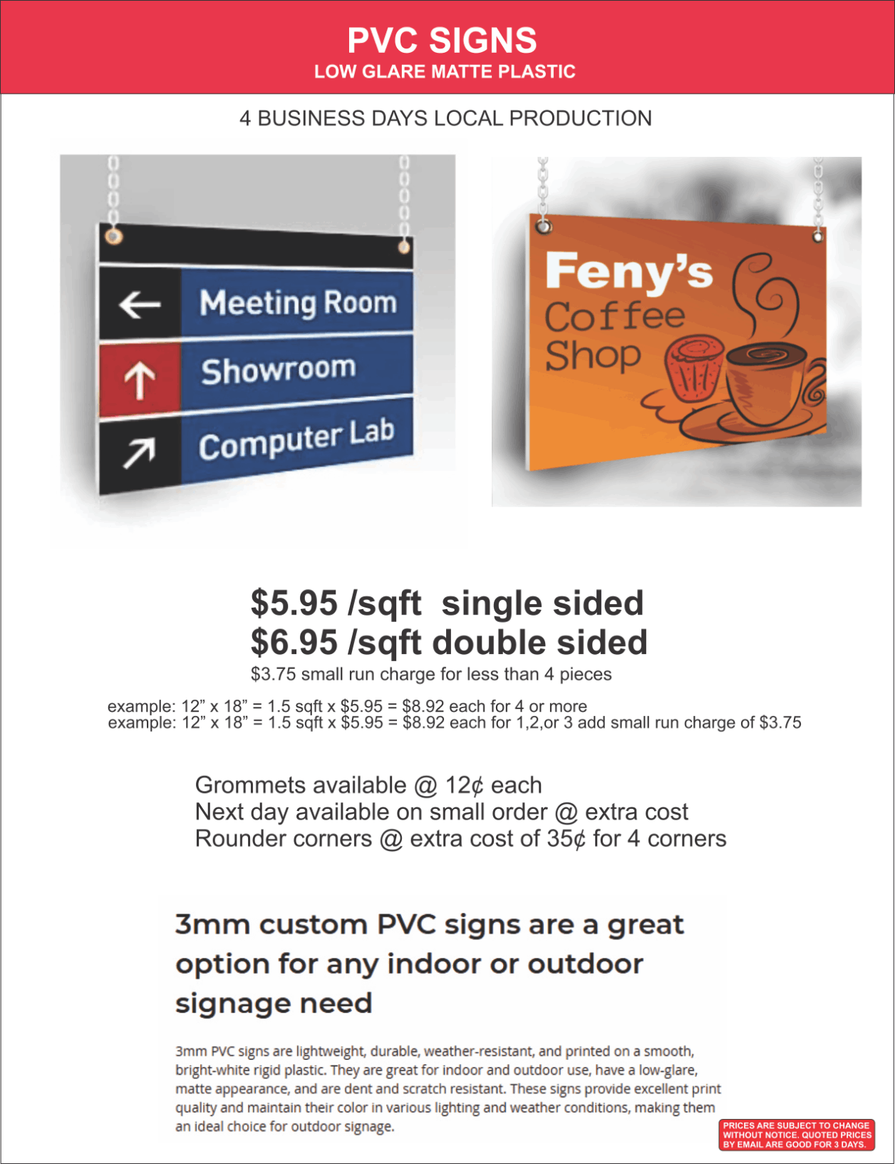 Note: Prices are subject to change without notice, quoted prices by email are good for 3 days.